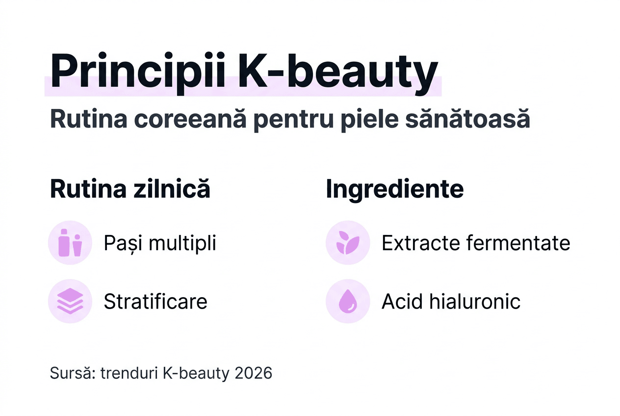 K-beauty reprezintă sistemul coreean de îngrijire a pielii bazat pe prevenție, hidratare intensivă și rutine multi-strat de până la 10 pași. Originile sale se regăsesc în cultura coreeană tradițională care prioritizează tenul impecabil ca semn al sănătății. Astăzi, K-beauty combină ingrediente naturale cu tehnologii avansate precum microacele și exosomii pentru rezultate clinice dovedite.